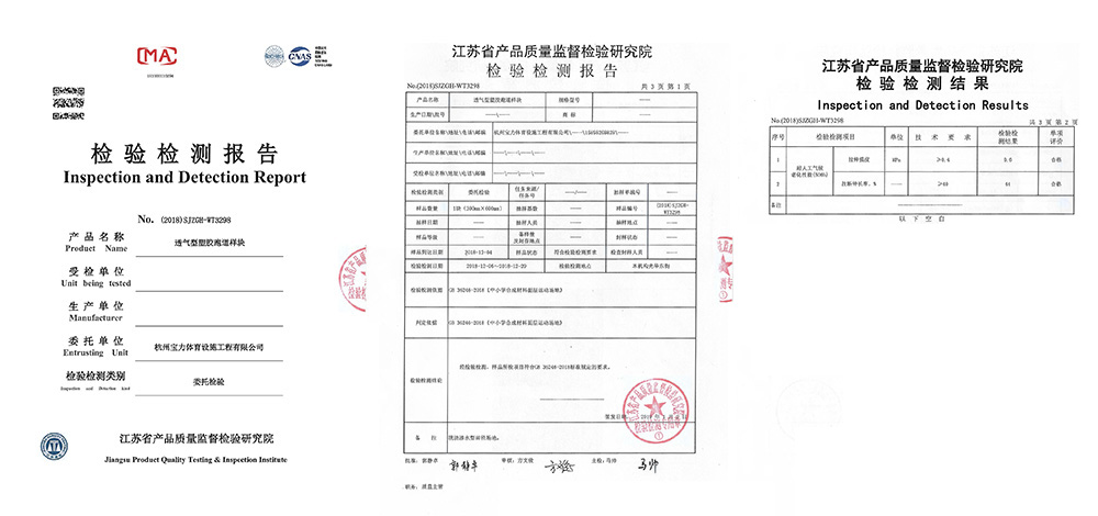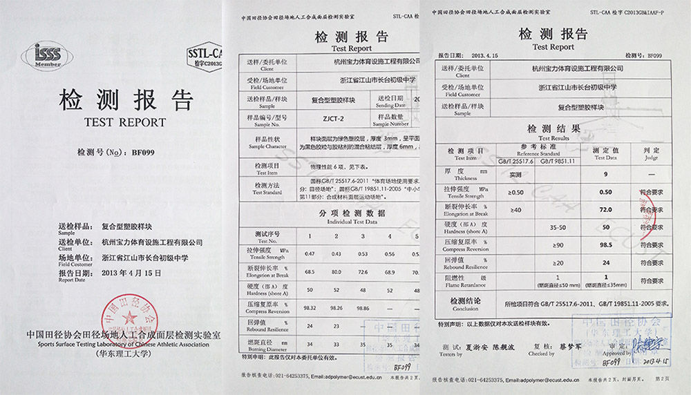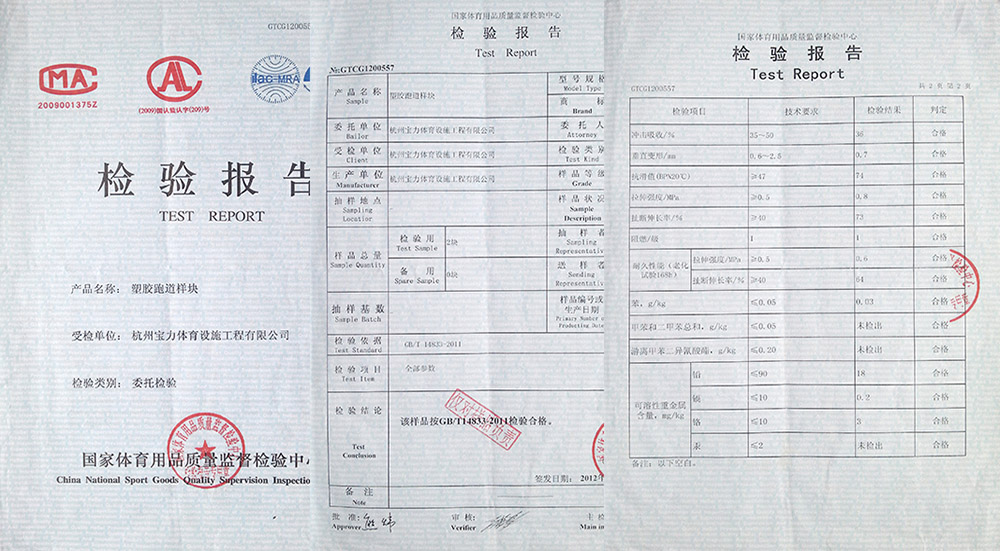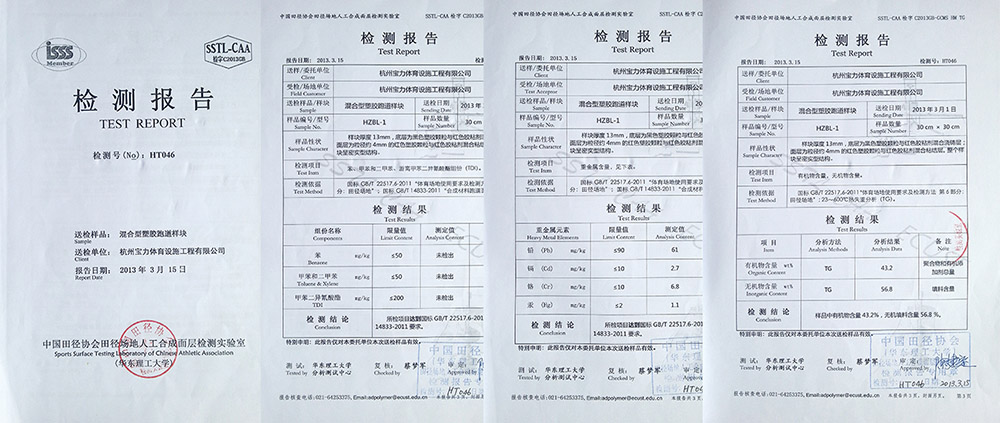 寶力體育公司塑膠跑道嚴格按照新國標GB63246-2018文件及上海市團體標準T/310101002-C003-2016檢測,總揮發性有機化合物釋放速率(TVOC)、苯、甲苯和二甲苯總和、 游離甲苯二異氰酸酯(TDI)、可溶性鉛、可溶性鎘、可溶性鉻、可溶性汞所有指標符合標準要求,安全、環保。