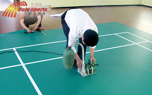 PVC塑膠球場施工鋪設流程包括:自流平施工--打底;自流平施工--攪拌;自流平施工--鋪設;地板的鋪裝--預鋪及裁割;地板的鋪裝--粘貼;地板的鋪裝--排氣、滾壓;地板的鋪設--開縫;地板的鋪裝--焊縫。