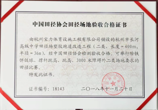 由杭州寶力體育設(shè)施工程有限公司(以下簡(jiǎn)稱(chēng):寶力體育)鋪設(shè)的杭州市長(zhǎng)河高級(jí)中學(xué)藍(lán)色環(huán)保塑膠跑道現(xiàn)已完美竣工,場(chǎng)地為400米標(biāo)準(zhǔn)塑膠跑道,經(jīng)中國(guó)田徑協(xié)會(huì)檢測(cè)驗(yàn)收合格,可舉行二類(lèi)場(chǎng)地要求的田徑比賽!