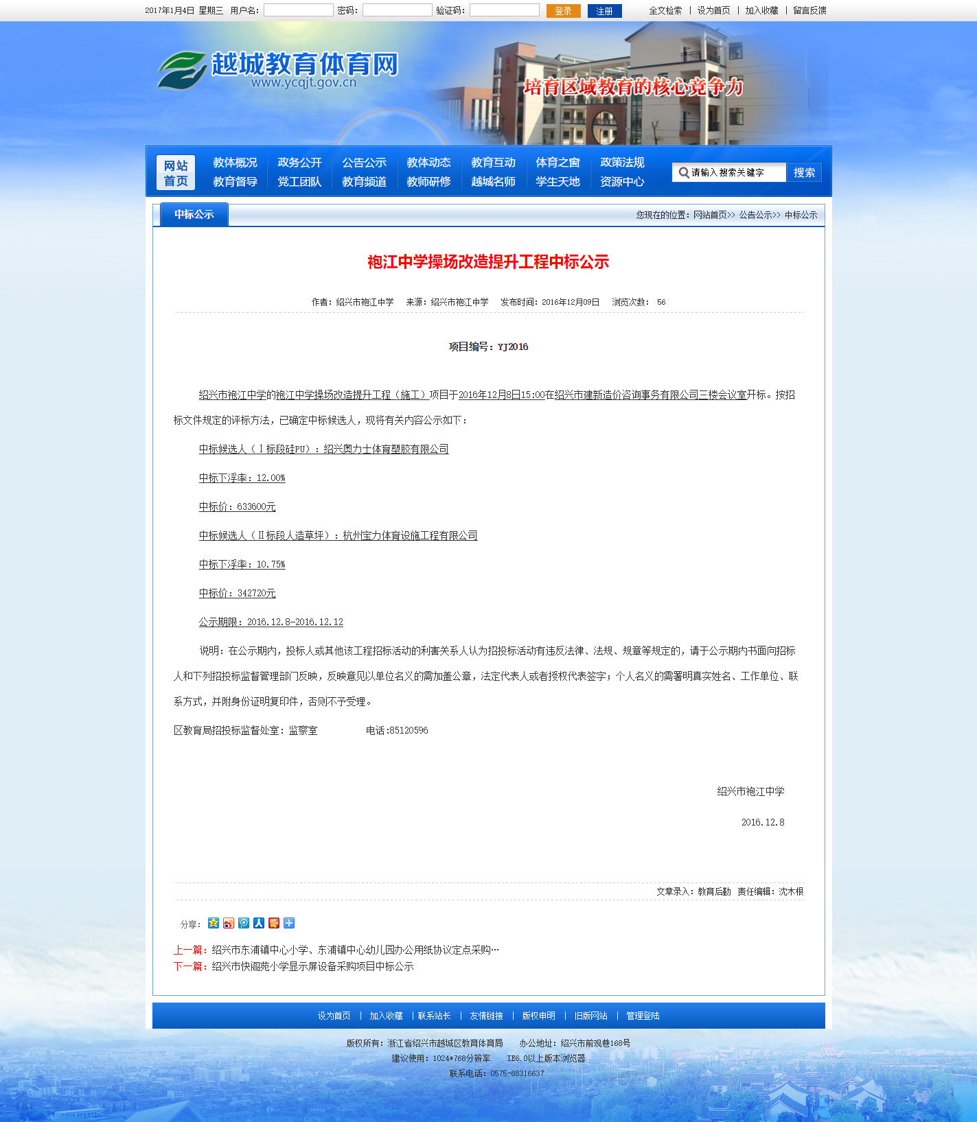 杭州寶力體育中標紹興市袍江中學操場改造提升工程(二標段)