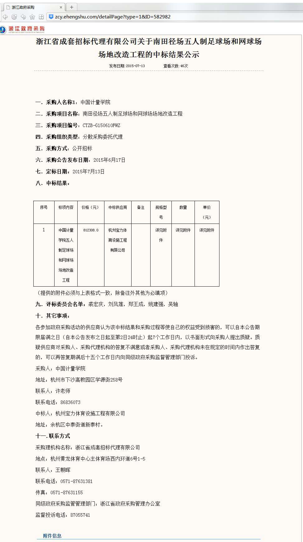 杭州寶力體育中標(biāo)中國(guó)計(jì)量學(xué)院五人制足球場(chǎng)和網(wǎng)球場(chǎng)地改造工程
