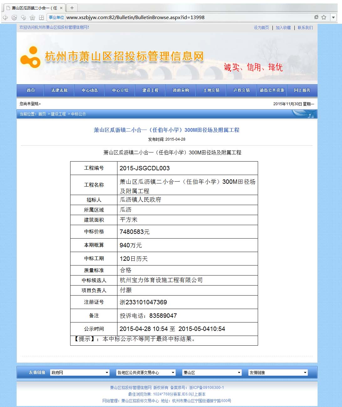2015年4月28日中標蕭山區(qū)瓜瀝鎮(zhèn)二小合一(任伯年小學)300M田徑場及附屬工程
