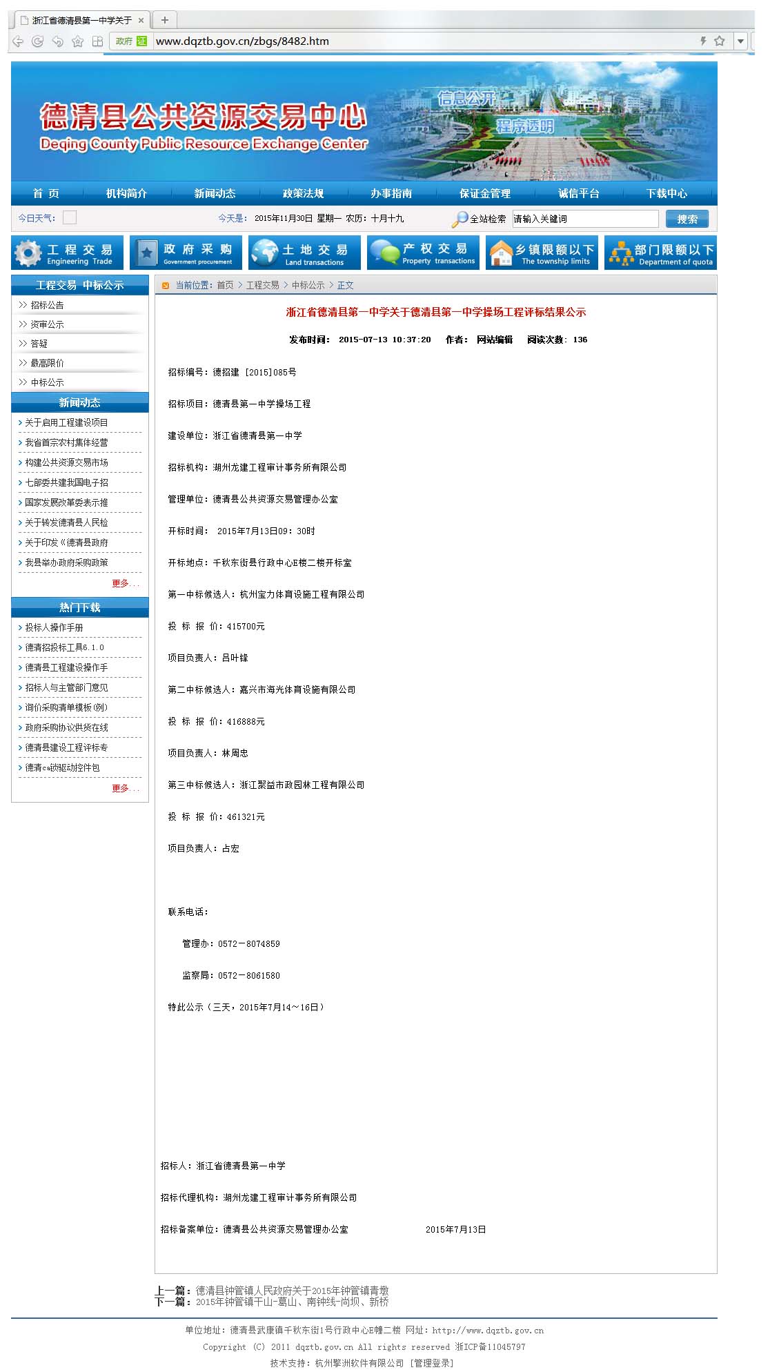 2015年7月13日中標德清縣第一中學操場工程